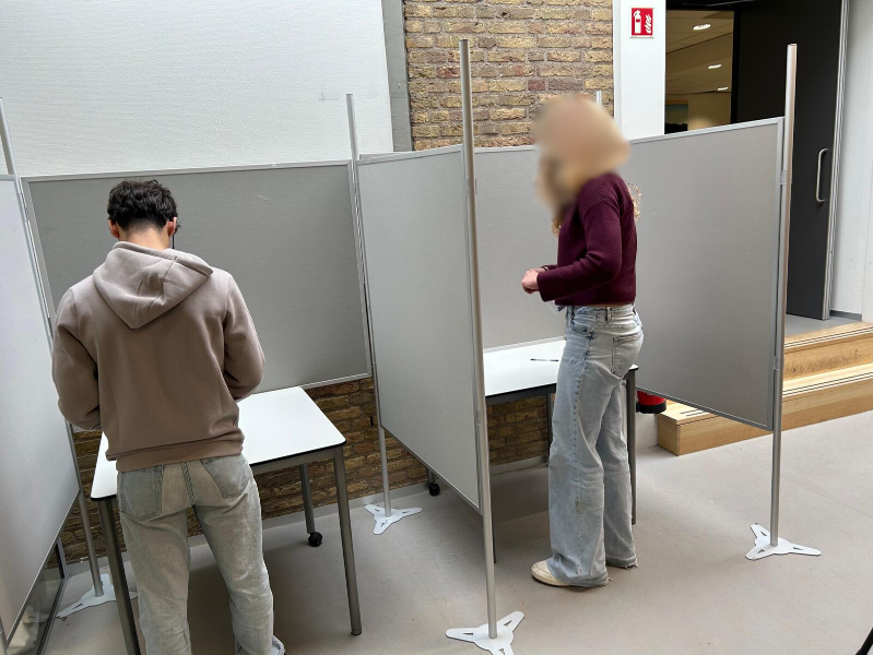 Bij het maatschappijleer lokaal stonden twee echte stemhokjes en een officieel stembureau, bemand door onze eigen leerlingenraad. Zij zorgden ervoor dat alles eerlijk en soepel verliep, net als bij “echte” verkiezingen. Per klas kwamen de leerlingen met hun docent langs om hun stem uit te brengen.
